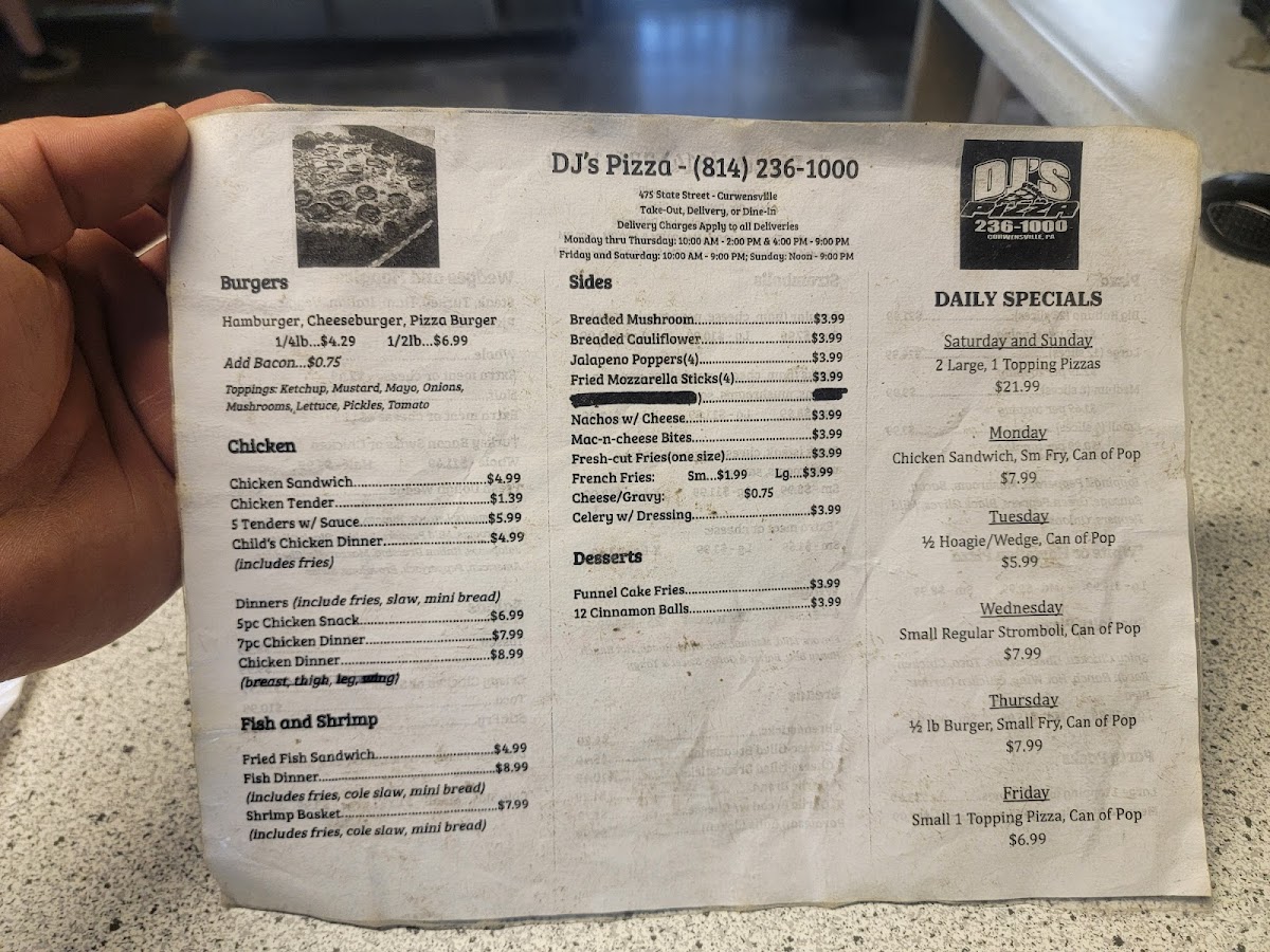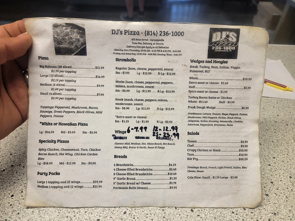 Welcome to D J's Pizza, a hidden gem in Curwensville, PA, where quality meets community spirit. Nestled at 475 State St, this pizzeria not only serves remarkable pizzas but embodies a friendly atmosphere that keeps customers returning. The star of the menu is undoubtedly the Big Kahuna pizza, boasting a perfectly balanced sauce, fresh toppings, and a crust with just the right bite, all for $21.99.